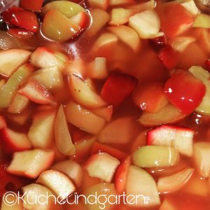 - Die Apfelstücke zusammen mit dem Zucker und den Wasser 5min kochen lassen und ausschalten. Zitronensaft dazugeben und 45min ziehen lassen. Jetzt ist der Sirup fertig.