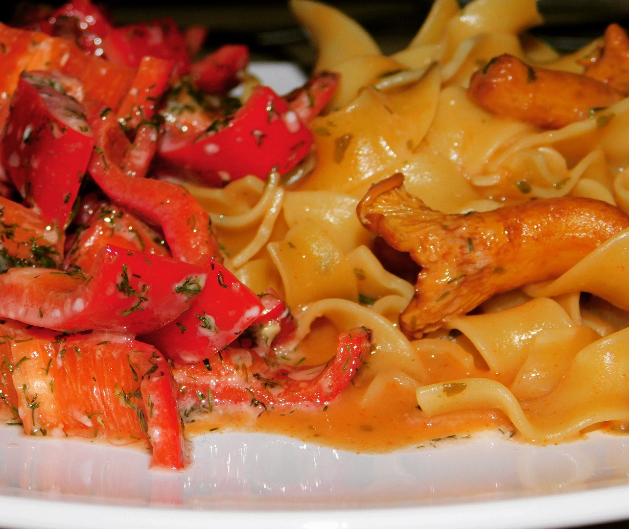 Pfifferlingrahm-Nudeln mit Paprikasalat
