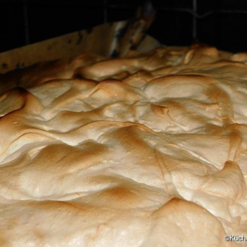 - Eiweiß mir dem Zucker und der Prise Salz aufschlagen, bis eine feste Masse ensteht. Nach Ablauf der 22min auf dem Rhabarber verteilen und weitere 15min backen. Danach auf einem Rost abkühlen lassen.