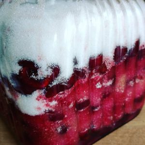 Nun werden die Kirschen abwechselnd mit dem Zucker (und nach Belieben den Gewürzen) in ein Gefäß geschichtet, abgedeckt und in die Sonne gestellt. Hier bleibt es nun für etwa 5 Wochen stehen und wird täglich umgerührt.