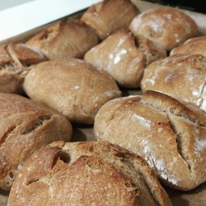 - Teiglinge mit etwa 150g abstechen, etwas platt drücken und mit Mehl bestreuen. Den Rand von oben und unten jeweils zur Mitte einschlagen. Den Schluss nach unten auf ein Bäckerleinen geben und nochmals 30min gehen lassen.