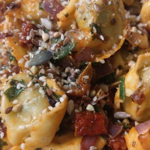 - Beim Anrichten ein paar gehackte Kerne & Saaten über die Tortellini geben und servieren 🙂